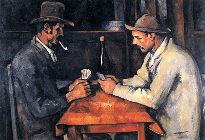 Los jugadores de cartas ya no es, desde su primera versión, un cuadro impresionista, pero no está claro qué es. Probablemente ni el propio Cézanne lo sabía y por eso se empeña en las sucesivas revisiones. El primer intento es fiel a su principio de que la clave está en “tratar a la naturaleza por medio del cilindro, la esfera y el cono, todo puesto en perspectiva adecuada”. Pero ahí hay demasiada gente para lo que él acostumbra. En la segunda versión simplifica, pero no aún lo suficiente. Es al tercer intento –la versión catarí- cuando da con la fórmula: el espectador de la partida es el propio espectador del cuadro. Los jugadores no están solos aunque lo parezca: nosotros les hacemos compañía.
